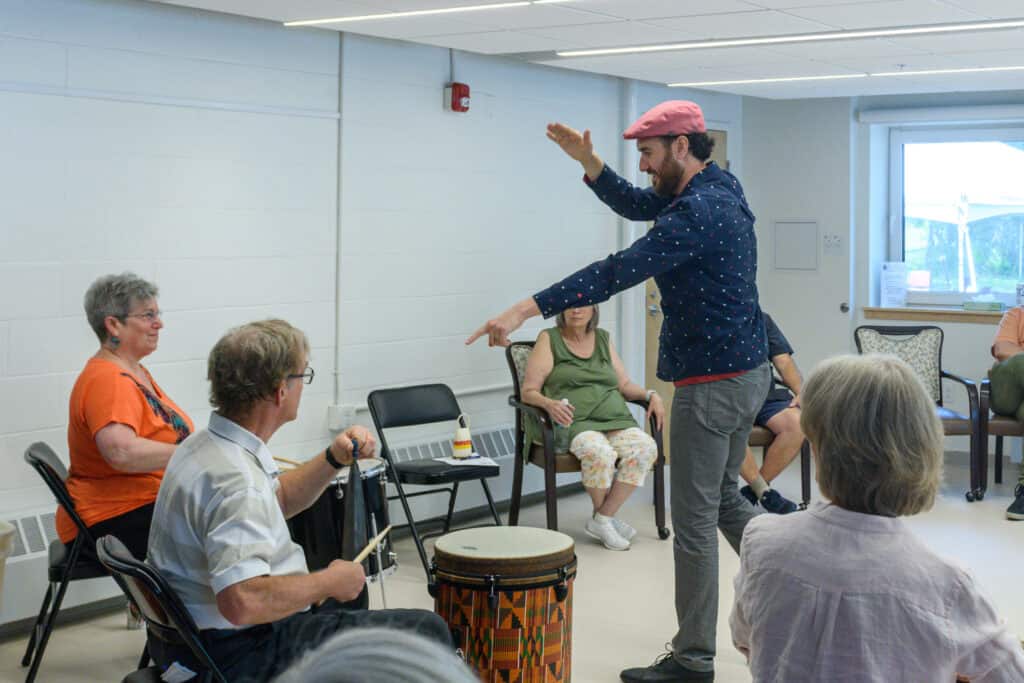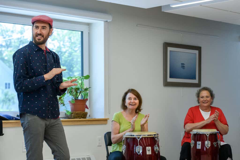 An exciting new partnership program in creative aging took place at PMAC this spring! On Monday June 21, PMAC and Portsmouth Senior Activity Center’s “A World of Percussion” class, led by teaching artist Brian Shankar Adler, presented their culminating performance to an intimate audience of friends and family. This performance, held at the recently reopened Portsmouth Senior Activity Center, showcased the learning and community building that took place over the course of the six week program.
