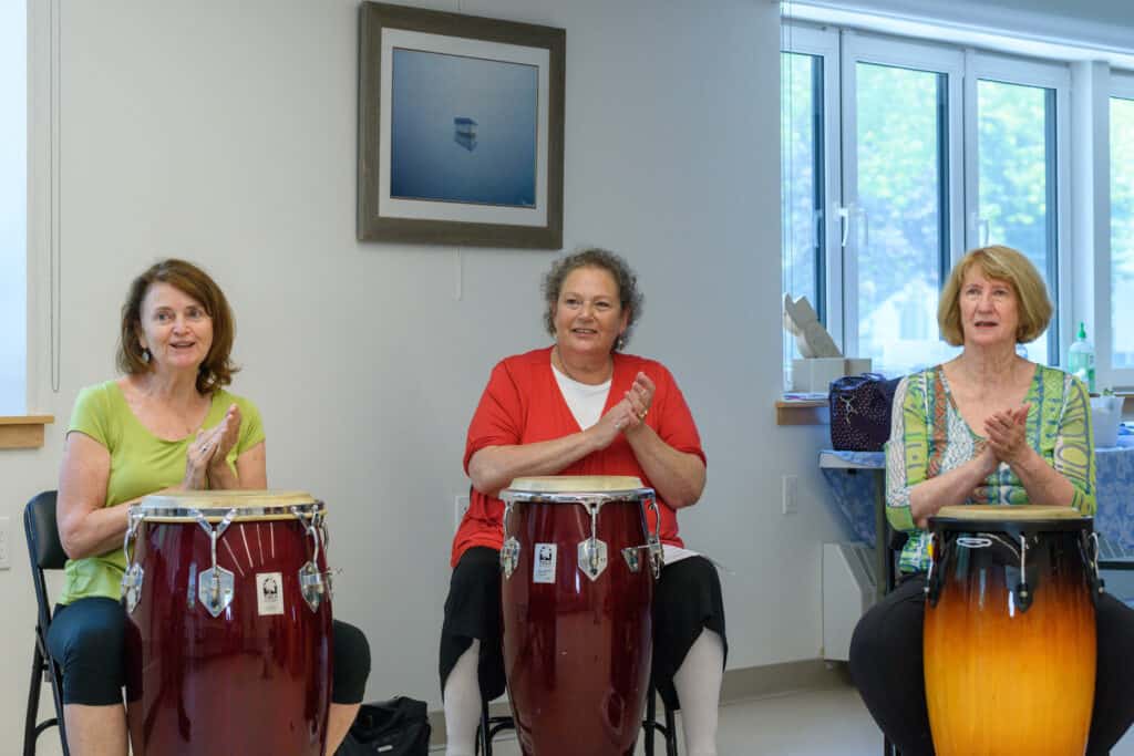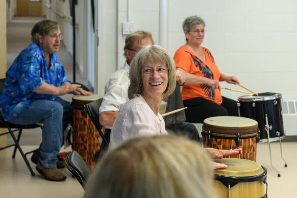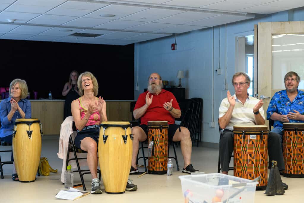 Many people ask “What is creative aging?” According to Lifetime Arts, creative aging programs use the arts to improve the quality of life for older adults (55+) through creative expression and social engagement. Creative aging programming is participatory and professionally taught, with a focus on skills mastery and social connections. PMAC’s “A World of Percussion” class focused on drumming and percussion, with the study of regional musical culture woven into the curriculum. Students studied rhythm, learned to use a variety of instruments, and even discovered how to improvise.