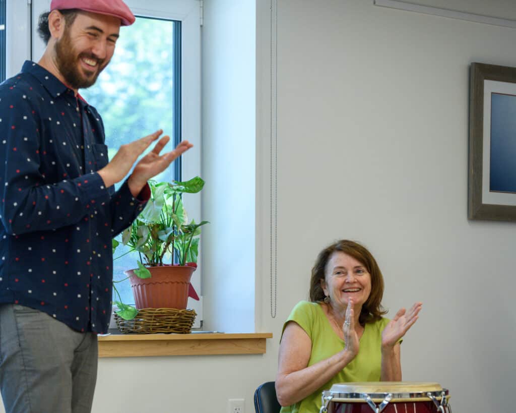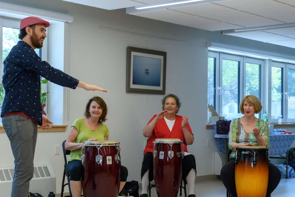 Having joined the PMAC faculty in fall 2020, I was thrilled to learn that there was an opportunity to adapt my global rhythms program for a seed grant from the National Guild of Community Arts Education,, to pilot a creative aging program in the Seacoast community. In 2006, funded by an arts grant in New York, I created A World of Percussion, which was offered to children and turned into a workbook. The partnership between PMAC and the Portsmouth Senior Activity Center marked the first time A World of Percussion curriculum was adapted and offered to creative agers, 55+.