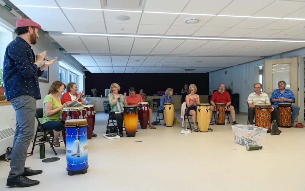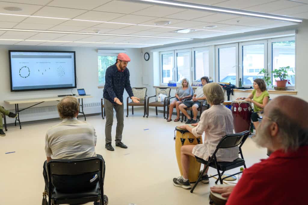 PMAC Teaching Artist Brian Shankar Adler leading the Creative Aging program “A World of Percussion” (photo by David J. Murray)